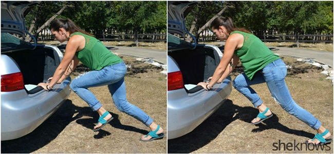 เปิดฝากระโปรงหลังรถขึ้นมา จากนั้นให้เราเอามือทั้งสองข้างยึดที่ขอบล่าง เหยียดปลายเท้าออกไปด้านหลัง จากนั้นก็ทิ้งน้ำหนักลงไปที่แขน (ลักษณะท่าทางคล้ายกับเรากำลังจะเข็นรถอยู่) จากนั้นก็ยกเท้าขึ้นคล้ายกับกำลังจะวิ่งขึ้นบันได ทำสลับแบบขาไปมาแบบนี้เป็นเวลา 1 นาที