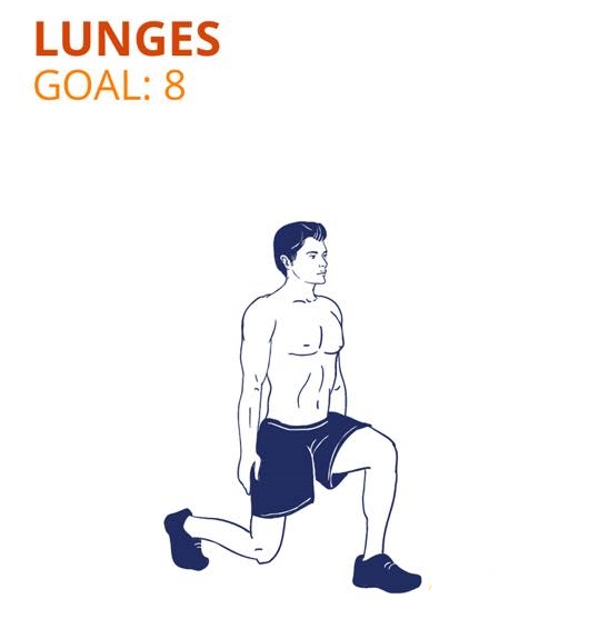 ท่าที่ 2 “Lunges” ยืนตัวตรงแล้วก้าวขาไปข้างหน้า 1 ข้าง แล้วย่อตัวลงให้หัวเข่าทำมุม 90 องศา จากนั้นกลับมายืนตัวตรง แล้วสลับทำอีกข้าง ทำทั้งหมด 8 ครั้ง ภายใน 30 วินาที
