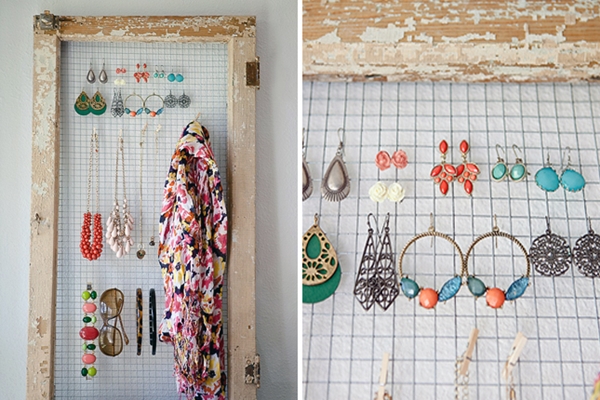 ไอเดียที่ 2 บานหน้าต่างตาข่ายเก่า ไม่ใช้แล้ว อย่าเพิ่งทิ้ง เอามาทำเป็นที่แขวนเครื่องประดับ เก็บอย่างมีระเบียบ และถ้าจัดแบบดีๆ หน่อย กลายเป็นดิสเพลย์ ตกแต่งบ้านสวยงามได้ด้วย