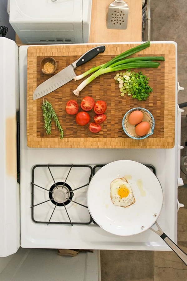 วิธีที่ 2 ประหยัดพื้นที่ ไม่ต้องหาซื้อเคาน์เตอร์ครัวสำหรับเตรียมอาหาร แต่ใช้พื้นที่เดียวกันกับเตาไฟฟ้านี่แหละ แค่หาเขียงมาครอบลงไป ก็ใช้งาน 2 in 1 กันได้แล้ว