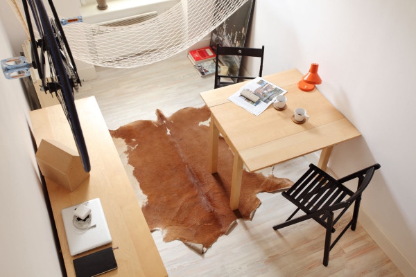 ถัดมาบริเวณอื่นๆ ในห้องขนาดเล็กๆ ห้องนี้ ก็แบ่งเป็นพื้นที่ทำงานรวมทั้งสามารถกางเป็นโต๊ะรับประทานอาหารไปในตัวด้วยเช่นเดียวกัน มีตู้เก็บของอยู่อีกฝั่ง ด้านบนก็ทำที่แขวนจักรยาน พาหนะสุดโปรดเอาไว้ นอกจากนี้ยังมีพื้นที่พักผ่อนสบายๆ ไปในตัวให้ผ่อนคลาย เป็นเปลญวนตาข่ายให้นอนเพลินๆ หรือ นั่งอ่านหนังสือชิลๆ ก็ได้ด้วยนะ เป็นยังไงล่ะคะ ไอเดียนี้ น่าทึ่งจริงๆ เลยเนอะ ที่สำคัญทั้งหมดภายในห้องเล็กๆ ห้องนี้แต่งด้วยสไตล์มินิมอล เน้นโทนสีขาวและไม้สีอ่อน แบบว่าสบายตา และทำให้ห้องดูใหญ่ขึ้นกว่าเดิม ทั้งที่จริงๆ แล้วมีพื้นที่เพียงแค่ 13 ตร.ม. เท่านั้นเอง