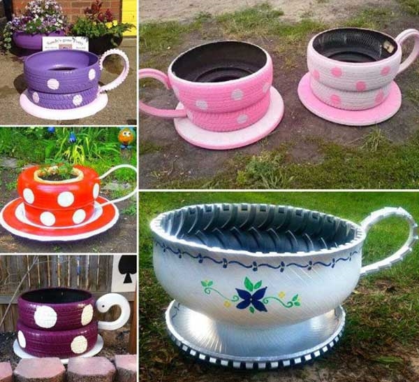 12. กระถางต้นไม้ถ้วยกาแฟยักษ์จากยางรถยนต์เก่ามาเพ้นท์สีสัน หรือ ใช้เป็นที่นั่งเก๋ๆ