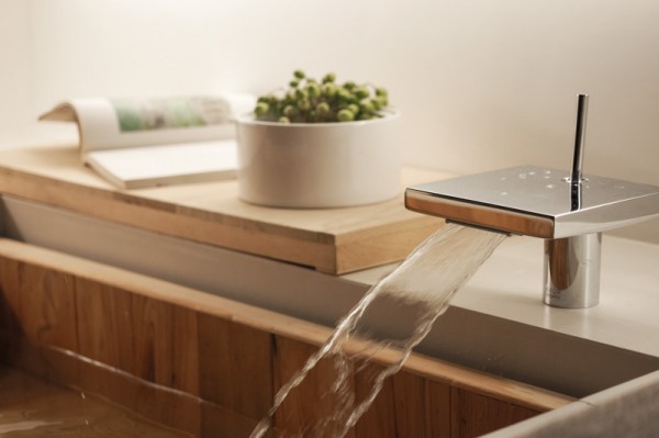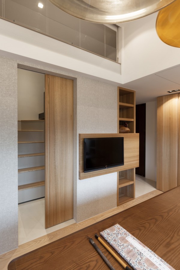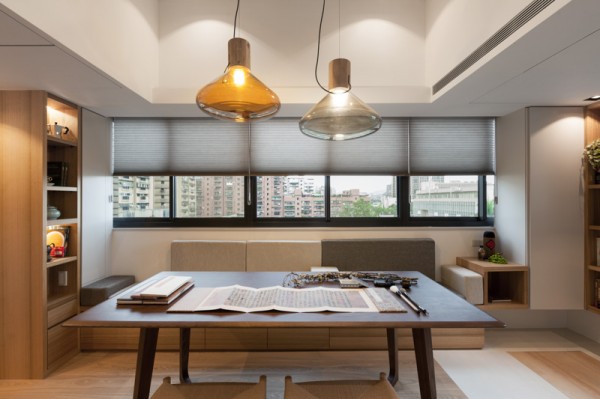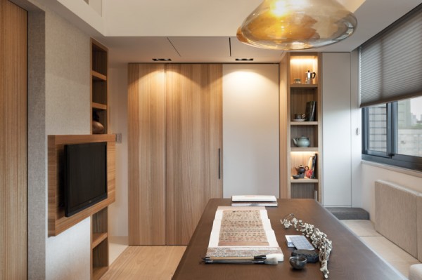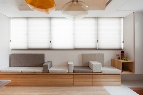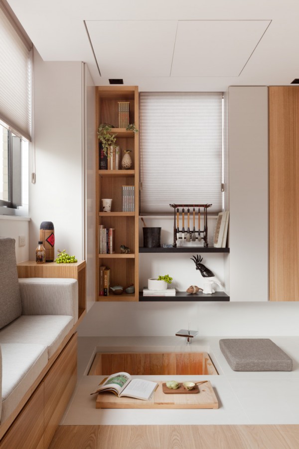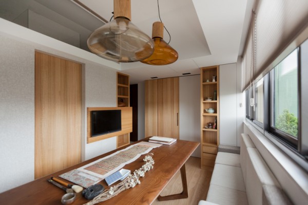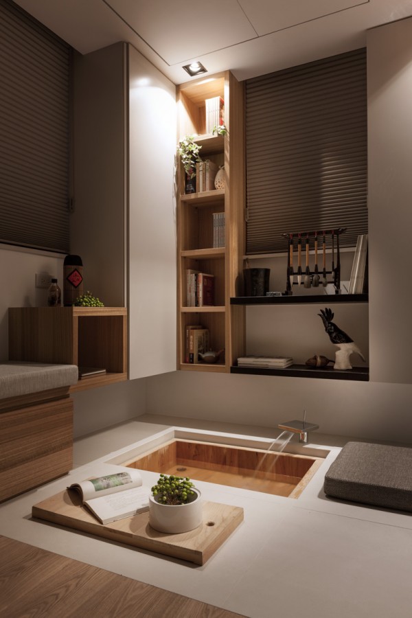 บริเวณพื้นที่นั่งเล่น ซึ่งใช้เป็นส่วนของพื้นที่สังสรรค์ พบปะพูดคุยกันของสมาชิกในครอบครัวเป็นหลักอย่างห้องนี้ ตกแต่งไปด้วยโทนสีอ่อนๆ มีโซฟาตัวยาวติดผนังสีเทาและขาว ด้านใต้โซฟายังเป็นลิ้นชักให้สำหรับเก็บของได้มากกมายด้วยล่ะค่ะ โต๊ะไม้ตัวยาวตามแนวโซฟาอยู่กลางห้อง ซึ่งใช้เป็นทั้งโต๊ะรับแขกและโต๊ะรับประทานอาหารไปในตัว โทรทัศน์ติดอยู่บนกำแพงบริเวณด้านหน้า มุมสุดของห้องด้านหนึ่งดูแล้วเหมือนเป็นตู้ไม้ แต่เมื่อเปิดออกกลับเป็นห้องทำงานซ่อนอยู่ มีเฟอร์นิเจอร์อื่นๆ ตกแต่งในห้องไม่กี่ชิ้น ดูเรียบง่าย สบายตา อีกฝั่งหนึ่งของห้องก็เป็นมุมพักผ่อนสบายๆ บรรยากาศดี มีสระน้ำสำหรับทำสมาธิด้วยนะบริเวณนี้ ซึ่งหากไม่ใช้งานก็สามารถใช้ไม้กระดานปิดเอาไว้ได้ด้วยเช่นกัน