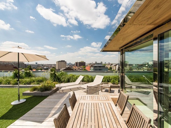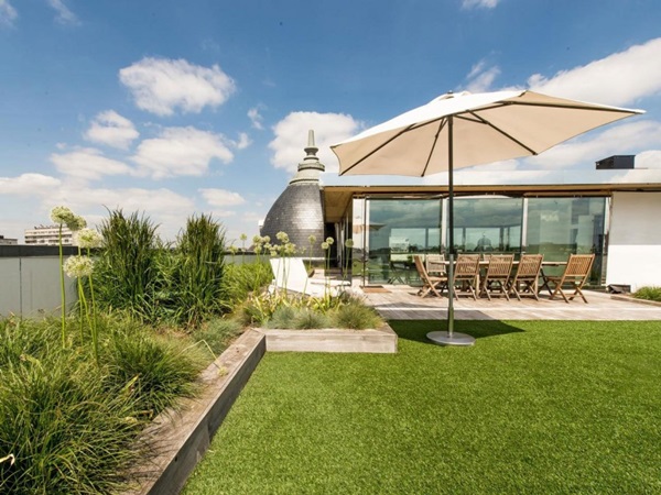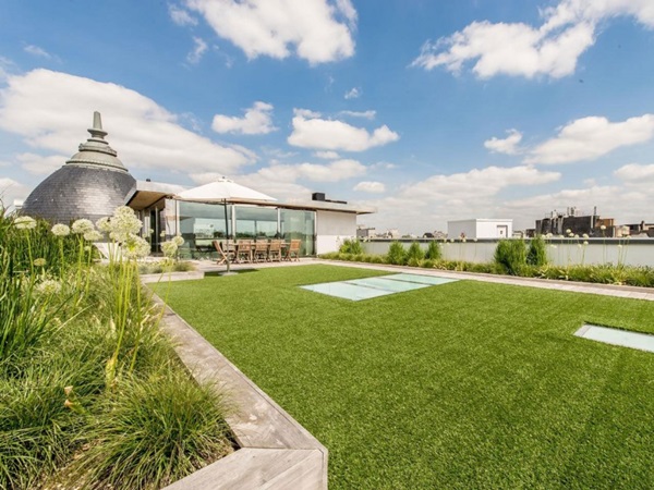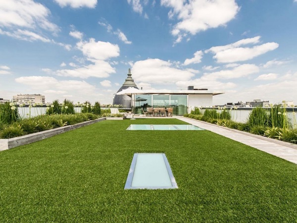 ที่พักแนวดิ่งมักไม่ค่อยมีสนามหญ้าหรือสวนสวยในพื้นที่ของตัวบ้านสักเท่าไหร่ ส่วนใหญ่เราจะเห็นแบบเป็นพื้นที่สนามหญ้าส่วนรวมกันซะมากกว่า แต่สำหรับไอเดียตกแต่งอพาร์ทเม้นท์นี้ จะเปลี่ยนพื้นที่ดาดฟ้าบนอาคารให้กลายเป็นเป็นสวนพักผ่อนที่ร่มรื่นมากๆ มีสนามหญ้ากว้าง ชุดโต๊ะรับแขกให้นั่งพักผ่อน เก้าอี้อาบแดดให้ผ่อนคลายอีกด้วยค่ะ ซึ่งเราก็คิดว่าเป็นอีกไอเดียที่น่าสนใจสำหรับใครที่อยู่บ้านประเภทตึกแถว อาคารสูง ก็จะมีไอเดียเพิ่มพื้นที่สีเขียวให้กับบ้านกันมากขึ้นได้ด้วยค่ะ ว่าแล้วก็ลองไปชมไอเดียนี้ไว้เป็นแบบกันดูค่ะ