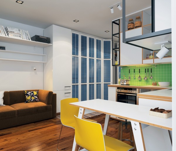 เป็นอพาร์ทเม้นท์ขนาดเล็กมากๆ มีพื้นที่เพียง 23 ตร.ม. เท่านั้นเอง ตกแต่งภายในด้วยโทนสีสดใส เขียว น้ำเงิน เหลือง ร่วมกับสีขาว ให้ห้องดูทันสมัยตลอดเวลา มีห้องนั่งเล่นขนาดเล็กด้วยโซฟาสีน้ำตาล มุมรับประทานอาหารสำหรับสองคนติดอยู่ข้างห้องครัวแบบประหยัดพื้นที่ เลือกใช้โต๊ะรับประทานอาหารแบบที่สามารถพับเก็บได้ ในเวลาที่ไม่ได้ใช้งาน เป็นการเพิ่มพื้นที่ใช้สอยและไม่ทำให้ห้องดูรกและน่าอึดอัดจนเกินไป ด้านข้างทางเดินของห้องอพาร์ทเม้นท์ทำเป็นตู้เก็บของเรียงต่อกันด้วยบานพับสีฟ้าขาวสวยงาม เพิ่มพื้นที่จัดเก็บที่มีอยู่น้อยนิดในห้องให้เยอะขึ้น และยังเป็นการซ่อนสิ่งของต่างๆ ที่ไม่ต้องการให้ใครเห็นรกๆ ด้านนอกไว้ด้านในอีกด้วยค่ะ