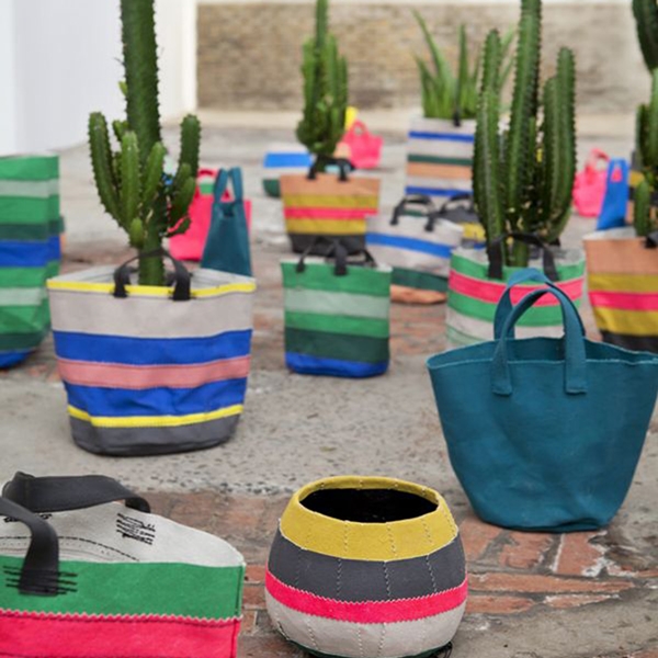 ถ้าพื้นของคุณมีแต่กรวด อิฐ หิน ปูน ไม่มีสนามหญ้า ก็หากระเป๋าหรือตะกร้าสีสันสดใส มาใส่กระถางต้นไม้ไว้ด้านใน วางเรียงแบบนี้ ก็ได้สวยขนาดเล็กสวยๆ กันแล้วล่ะค่ะ