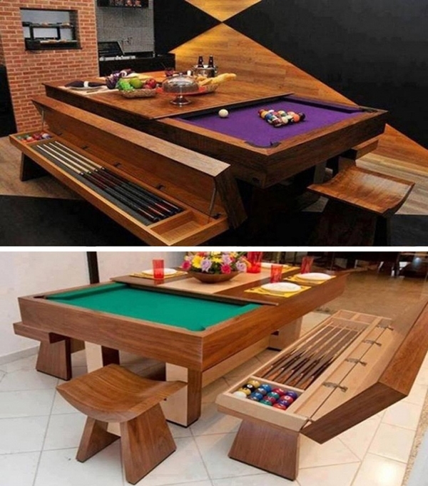 8. นี่ก็อีกดีไซน์โต๊ะรับประทานอาหารที่เป็นโต๊ะสนุกเกอร์ให้เล่นสนุกในตัว แต่อันนี้ที่เก็บอุปกรณ์อยู่ที่เก้าอี้ม้านั่งด้วยนะเออ