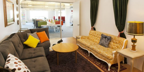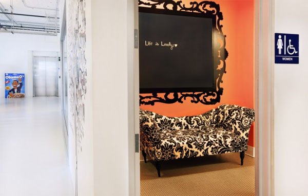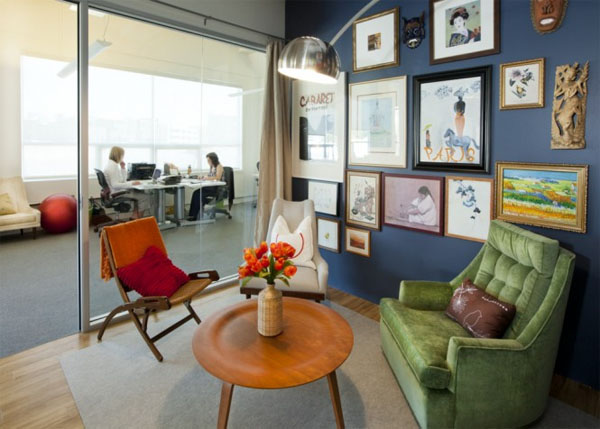ออฟฟิศสวยๆ แห่งนี้ได้รับการออกแบบตกแต่งภายในจาก Michael Garcia and Farid Tamjidi มีขนาดพื้นที่ทั้งหมด 25,000 ตารางฟุต ภายในประกอบไปด้ยโซนพักผ่อน ห้องรับแขก ที่ตกแต่งด้วยสไต์วินเทจ โซฟาวินเทจ กับภาพงานศิลปะสวยๆ ให้ความรู้สึกเหมือนอยู่บ้าน ผ่อนคลาย สบายๆ ไม่อึดอัดกับการคุยงาน อีกส่วนหนึ่งเป็นโซนคาเฟทีเรีย มีตู้เย็นสีๆ จาก SMEG น่ารักมาก เมื่อนำหลายๆ สีมาวางเรียงกัน ในตู้เย็นนี้เต็มไปด้วยของกิน และมีที่นั่งรับประทานอาหารสำหรับให้พนักงานด้วย และในส่วนของโต๊ะทำงาน มีการแบ่งพาดิชั่นแบบครึ่งหน้า และใช้สีสันเข้ามาเพิ่มความสนุก แต่งแต้มบรรยากาศในการทำงานให้ดูสนุกสนานมากขึ้นคะ ในส่วนของห้องประชุม ก็เป็นเหมือนกับการนั่งรับประทานอาหารกับคนในครอบครัวมากกว่าเป็นการนั่งประชุมงาน ทุกห้องล้วนถูกตกแต่งให้เป็นธีมเดียวกัน ในสไตล์โมเดิร์นวินเทจ