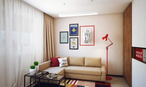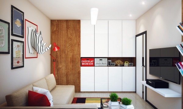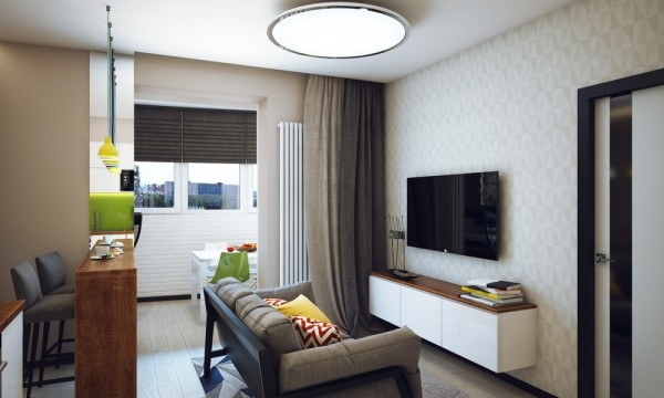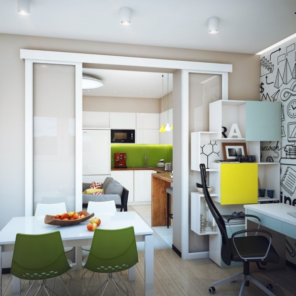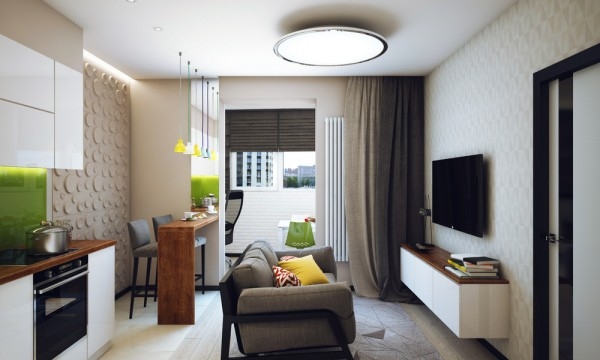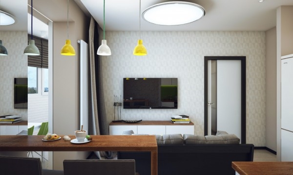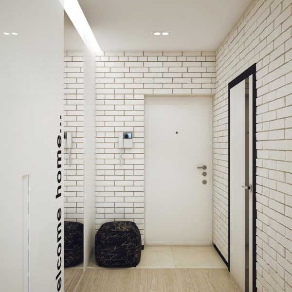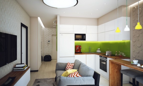 สำหรับอพาร์ทเม้นท์ห้องนี้เป็นของ Pavlova Oksana ชายหนุ่มที่มีหัวทางด้านการออกแบบ เขาตกแต่งออกแบบภายในให้มีพื้นที่เหมาะสมกับการทำกิจกรรมต่างๆ ของตัวเขา มีห้องนั่งเล่นและห้องครัวที่เปิดโล่งถึงกัน ตกแต่งในโทนสีขาว เทา และเขียวมะนาวสดใส ทำให้บรรยากาศภายในบ้านดูครื้นเครง อบอุ่นด้วยกำแพงอิฐสีขาวบางบริเวณที่ตกแต่งภายในอย่างสวยงาม