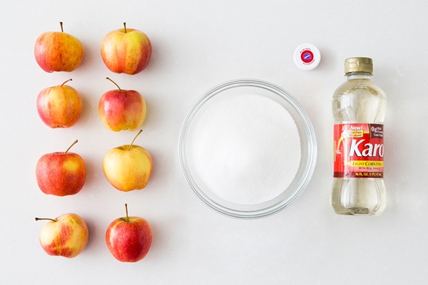 STEP 1 นำไม้ลูกอมมาเสียบลงไปที่แอปเปิ้ลแต่ละลูกเตรียมเอาไว้ จากนั้นหันไปเตรียมหม้อขนาดใหญ่สำหรับละลายน้ำตาล, Light corn syrup, น้ำ เข้าด้วยกัน โดยต้มไว้ประมาณ 20-30 นาที จากนั้นใช้เทอร์โมมิเตอร์วัดอุณหภูมิให้ได้ 300 องศาฟาเรนไฮต์ นำสีผสมอาหารสีแดงเข้าไปผสมและคนให้เข้ากัน จากนั้นจึงค่อยยกหม้อออกจากเตา