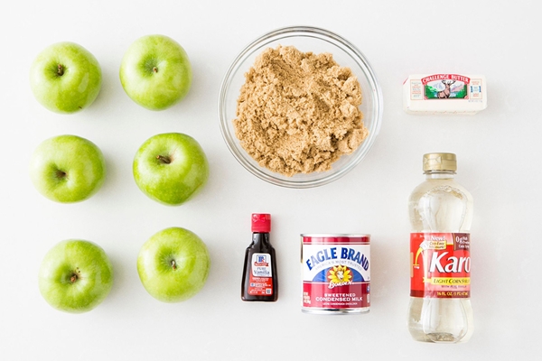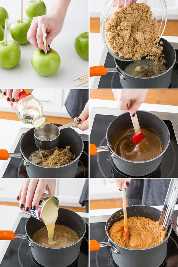 STEP 1 นำไม้ลูกอมมาเสียบลงไปที่แอปเปิ้ลแต่ละลูกเตรียมเอาไว้ จากนั้นหันไปเตรียมหม้อขนาดใหญ่สำหรับละลายเนย, น้ำตาล, Light corn syrup โดยใช้ไฟปานกลาง ต้มให้ละลายเข้ากันประมาณ 10-15 นาที เสร็จแล้วจึงนำนมข้นใส่เข้าไปคนจนได้เป็นคาราเมล เอาใช้เทอร์โมมิเตอร์วัดอุณหภูมิของคาราเมลต้องได้ค่าที่ 250 องศาฟาเรนไฮต์ เมื่อได้ค่าความร้อนของคาราเมลตามที่ต้องการแล้วจึงใส่วานิลลา และคนให้เข้ากัน จากนั้นยกหม้อออกจากเตา
