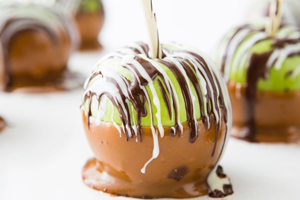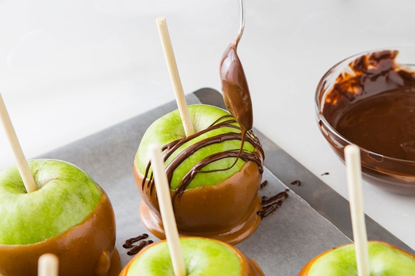 STEP 4 นำเอาช็อกโกแลตชิปใส่ชามและนำเข้าไมโครเวฟเพื่อให้ละลายประมาณ 1 นาที เปิดออกมาดูก่อนสักรอบ จากนั้นก็ค่อยเวฟต่อเนื่องอีก 30 วินาที เพื่อให้ละลายจนเสร็จสมบูรณ์ ไวท์ช็อกโกแลตก็ทำเช่นเดียวกัน ทำให้ละลายด้วยไมโครเวฟวิธีเดียวกัน เมื่อละลายช็อกโกแลตเรียบร้อยแล้ว ให้นำเอาช้อนมาตักช็อกโกแลตและไวท์ช็อกโกแลตขึ้น จากนั้นก็ส่ายราดไปมาบนแอปเปิ้ลเคลือบคาราเมล เป็นอันเสร็จเรียบร้อย