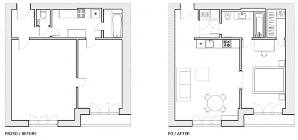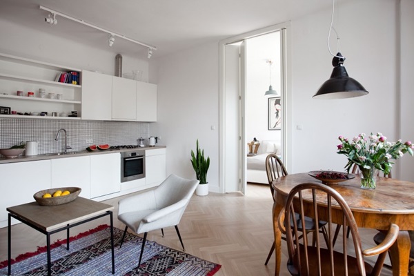 ภายในอพาร์ทเม้นท์แห่งนี้มีพื้นที่ใช้สอยทั้งหมด 56 ตารางเมตร ตกแต่งด้วยอิฐบล็อกบริเวณกำแพงร่วมปูนสีขาว เฟอร์นิเจอร์ที่เลือกใช้ตกแต่งเป็นเฟอร์นิเจอร์ไม้และร่วมสมัย ผสมผสานกันอย่างลงตัว บรรยากาศภายในดูอบอุ่น แม้ว่าจะตกแต่งด้วยของแต่งบ้านไม่เยอะนัก แต่ก็ไม่ได้ทำให้พื้นที่ภายในโล่งจนเกินไป ภายในตกแต่งแบ่งเป็นส่วนของห้องนั่งเล่นที่มีโซฟาเบาะผ้าสีน้ำเงิน ด้านหน้าปูด้วยพรมถักทอลายสวย ใกล้ๆ กันนั้นมีห้องครัวสีขาว และมุมรับประทานอาหารอยู่รวมกัน ใกล้ๆ จะมีห้องนอนซึ่งมีประตูปิดให้ความเป็นส่วนตัว