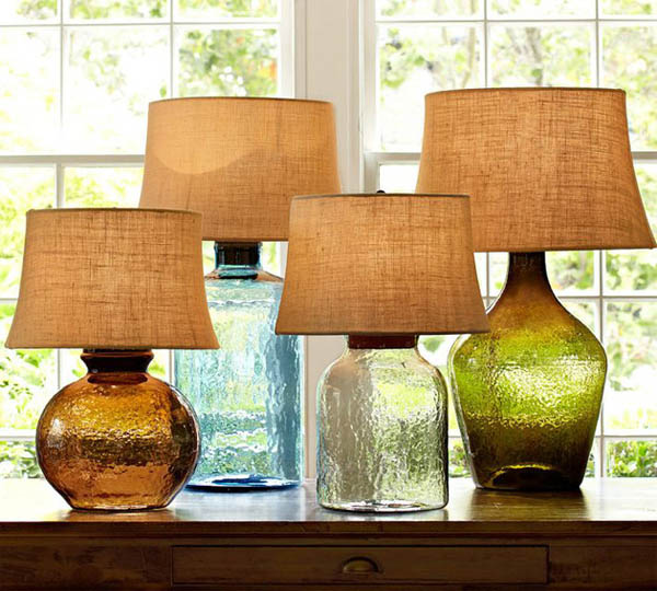 ความสวยงามของกระจกแก้วสีๆ หรือขวดแก้วไวน์สีสวยๆ เมื่อนำมาส่องกระทบไฟ ยิ่งทำให้ดูสวยงามมากยิ่งขึ้น และความสวยนี้เองที่ทำให้บริษัท Pottery Barn นำมาเป็นไอเดียในการประดิษฐ์โคมไฟขวดแก้วให้เป็นสีต่างๆ อย่างเช่น สีม่วง สีเขียว สีน้ำตาล เป็นต้นค่ะ เมื่อนำมาวางเป็นกลุ่มเดียวกันยิ่งสวยโดดเด่น สะดุดตา มากขึ้น ว่าแล้วเรามาชมผลงานโคมไฟขวดแก้วเลยค่ะ