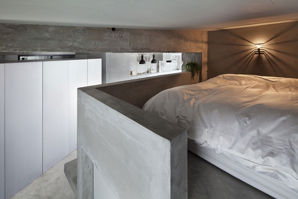 และต่อจากบริเวณนี้จะมีบันไดเล็กๆ พาขึ้นสู่ชั้นบนอีกโซน ซึ่งคือบริเวณของห้องนอนนั่นเองค่ะ บริเวณนี้ตกแต่งไปด้วยปูนเปลือยเช่นเดียวกัน ฐานเตียงนั้นก็ทำมาจากปูน มีเบาะสีขาวเป็นเตียงนอนสบายๆ และมีโคมไฟติดผนังกับต้นไม้สีเขียวกระถางเล็กๆ ตกแต่งบริเวณนี้