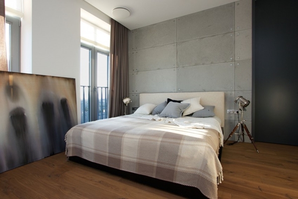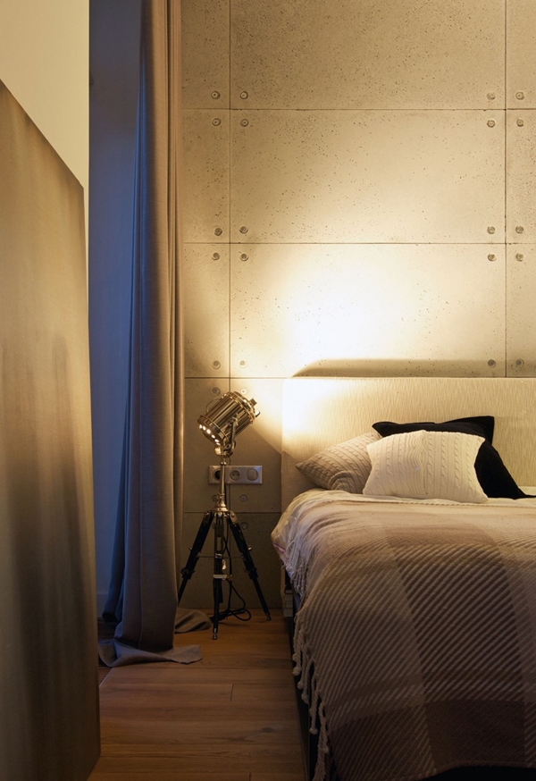 ภายในส่วนห้องนอนของอพาร์ทเม้นท์นี้มีด้วยกัน 2 ห้อง ห้องหนึ่งตกแต่งเป็นห้องของผู้ใหญ่ในโทนสีขาวและเทา กำแพงคอนกรีตที่ต่อเป็นแผ่นๆ ดูแล้วเท่ดีไม่เบาเลยล่ะค่ะ ตกแต่งในห้องนี้สไตล์อุตสาหกรรม คล้ายเป็นสตูดิโอ ไม่ตกแต่งด้วยเฟอร์นิเจอร์เยอะ มีเพียงเตียงนอน รูปภาพศิลปะวางพิงกำแพงเอาไว้แบบอาร์ตๆ และโคมไฟสตูดิโอ อีกห้องตกแต่งเป็นห้องนอนสำหรับเด็ก มีสีสันเข้ามาหน่อย เลือกใช้ผ้าปูที่มีสีสดใสบอกให้รู้ว่านี่คือห้องของเด็กหรือวัยทีน ผ้าม่านสีชมพูอ่อน มาพร้อมกำแพงอิฐสีขาว ของตกแต่งมีเพียงกรอบรูปเล็กๆ แนววินเทจสีขาวและเบาะไหมพรมทรงกลมน่านั่ง
