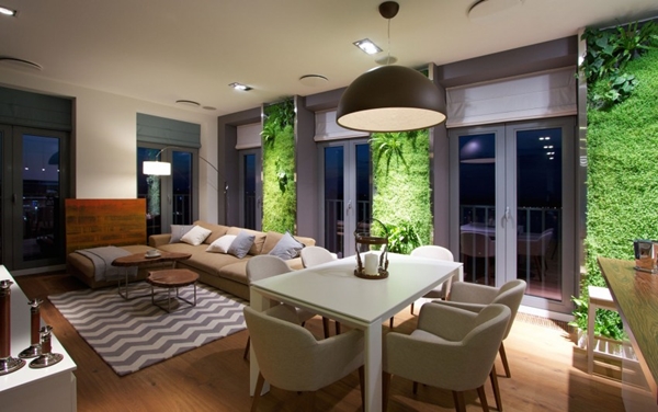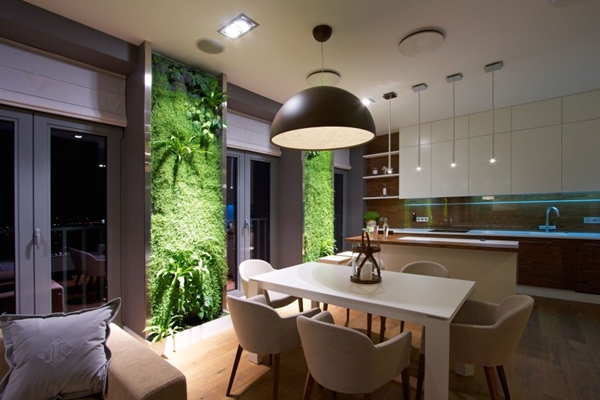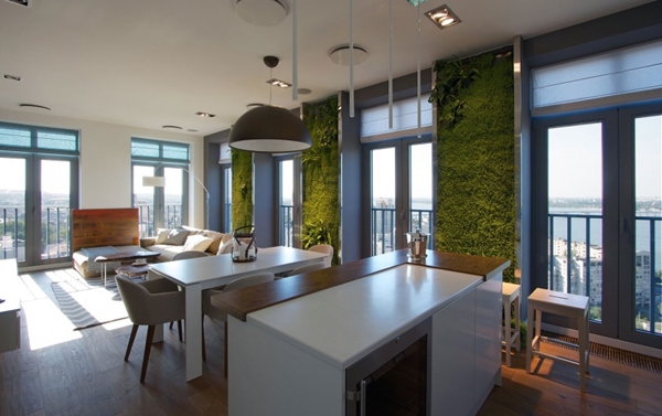 สำหรับอพาร์ทเม้นท์แห่งนี้ ตั้งอยู่ที่ Dnipropetrovsk ในประเทศยูเครน ตกแต่งออกแบบโดยบริษัทออกแบบ SVOYA Studio ภายในตกแต่งแบบทันสมัยในโทนสีขาว เทา ครีม บรรยกาศร่มรื่น ดูมีชีวิตชีวา โดดเด่นที่กำแพงต้นไม้สีเขียวที่ตกแต่งที่กำแพงสลับกับหน้าต่างไปเรื่อยของตัวห้อง ห้องครัวและมุมรับประทานอาหารอยู่ใกล้กับห้องนั่งเล่น เป็นโซนเปิดโล่ง ไม่มีประตูกั้น กำแพงไม้ฉากหหลังของที่วางโทรทัศน์ในส่วนของห้องนั่งเล่นก็ตกแต่งได้อย่างสวยงาม เล่นสีของไม้แต่ละแผ่นต่อสลับกันกลายเป็นลวดลาย