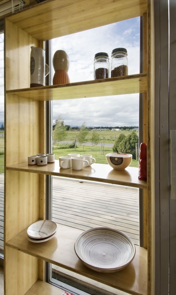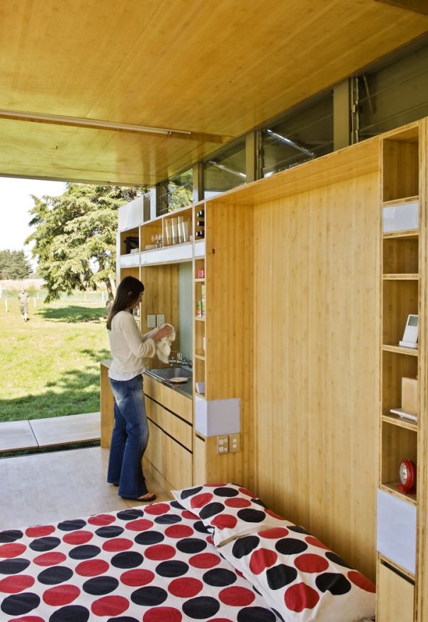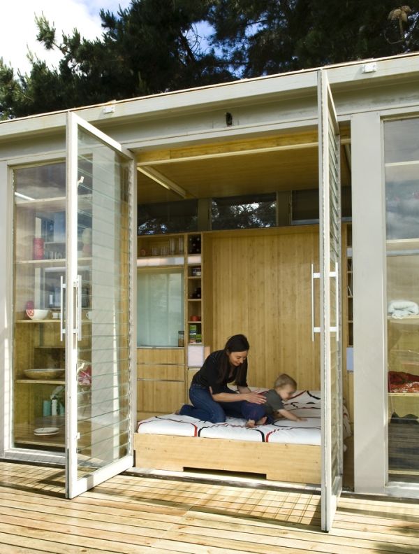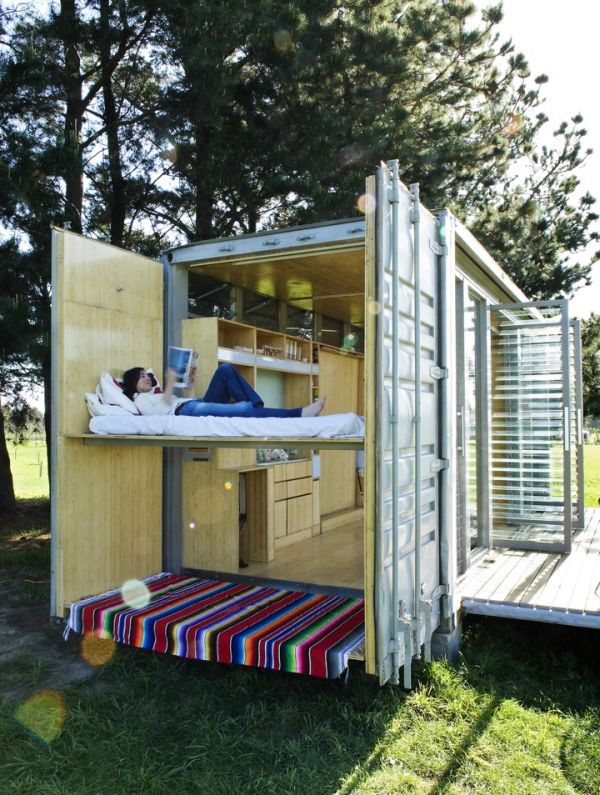 ตัวตู้คอนเทนเนอร์ด้านนอกทาด้วยสีขาวดูแล้วสะอาดตา ด้านในตกแต่งผนังกำแพงด้วยไม้สีอ่อนทั่วทั้งคอนเทนเนอร์ มีชานเทอร์เรซด้านนอกเป็นมุมพักผ่อน นั่งสบาย ด้านในตู้คอนเทนเนอร์ตกแต่งเป็นห้องต่างๆ แบบกะทัดรัด เฟอร์นิเจอร์สามารถพับเก็บได้ ซ่อนไว้กับผนังเพื่อไม่ให้กินพื้นที่ภายในมากนัก เตียงนอนอยู่กลางบ้าน แต่สามารถพับขึ้นเก็บชิดกำแพงไม่เกะกะเวลาไม่ใช้งาน ด้านข้างเป็นตู้เก็บของและส่วนของห้องครัวเล็กๆ สุดมุมทางเดินด้านหนึ่งเป็นห้องน้ำ และอีกด้านหนึ่งมีเตียงเล็กๆ ต่อกับประตูด้านข้างกลายมาเป็นพื้นที่นั่งเล่นสบายๆ โซฟาให้ผ่อนคลายได้อีกด้วยล่ะค่ะ เป็นไงบ้างคะการตกแต่งบ้านคอนเทนเนอร์หลังนี้ เห็นแล้วสวยน่าอยู่ดีจริงๆ เลย บรรยากาศของบ้านที่เรียบง่าย อยู่ท่ามกลางสนามหญ้าสีเขียว ร่มรื่น แถมยังเป็นบ้านที่เคลื่อนย้ายเปลี่ยนที่ไปได้เรื่อยๆ ไม่ยากอีกด้วย น่าสนใจจริงๆ คุณเห็นด้วยมั้ยคะ ^^