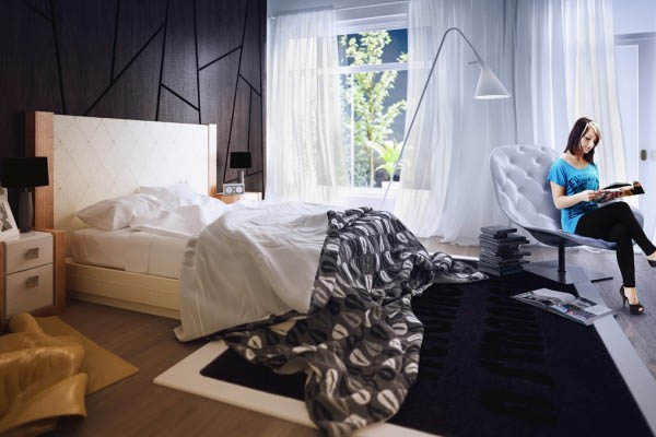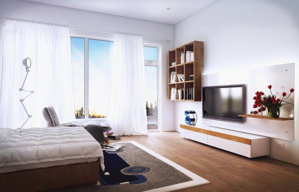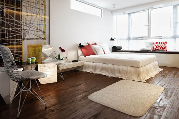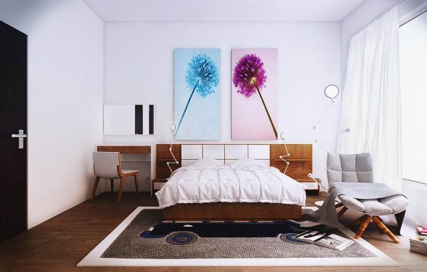 อีกทั้งการตกแต่งด้วยพรมที่มีลวดลายที่แฝงด้วยสีสันสดใสนิดหน่อย ก็เรียกความน่าสนใจของห้องนอนได้เป็นอย่างดีและยังตัดกับห้องนอนสีขาวอีกด้วยนะค่ะ ว่าแล้วเรามาชมกันเลยค่ะ
