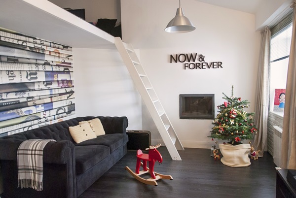 นอกจากนี้ พื้นที่ส่วนนั่งเล่นมีบันไดสีขาวพาขึ้นสู่ชั้นลอยที่โดดเด่น ตกแต่งมุมนี้ให้กลายเป็นที่นั่งเล่นพักผ่อนและเก็บของต่างๆ เพิ่มพื้นที่ใช้สอยในตัวห้องให้มากขึ้น ห้องนอน ห้องน้ำ มุมทางเดินก็ตกแต่งสวยงาม โดยรวมแล้วเป็นห้องที่สวยทันสมัย และดูอบอุ่นไม่เบา