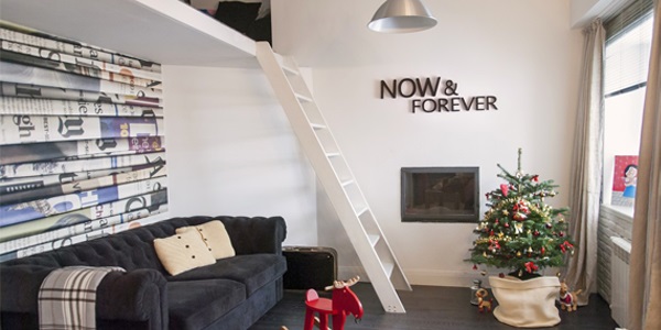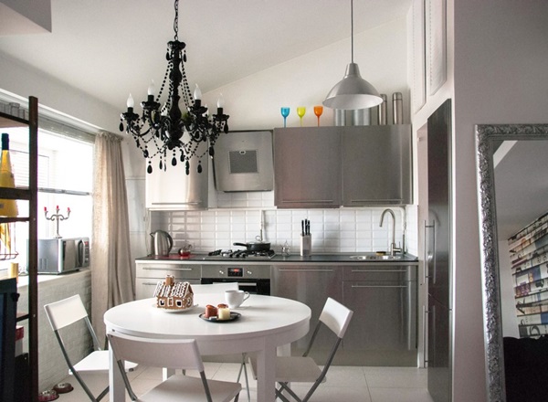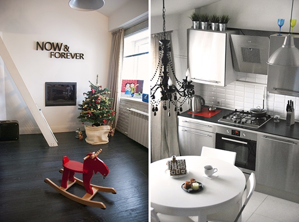 ภายในตกแต่งกำแพงด้วยโทนสีขาวเป็นหลัก ห้องดูสว่างสดใส เพราะมีหน้าต่างบานใหญ่เปิดรับแสงสว่าง บางมุมตกแต่งด้วยกระเบื้องสีขาวเรียงต่อกันคล้ายอิฐสร้างดีเทลสวยงามให้กับห้อง มีห้องนั่งเล่น ห้องรับประทานอาหาร และห้องครัว แต่ละห้องขนาดเล็กไม่ใหญ่นัก อยู่ใกล้ๆ กัน เป็นบริเวณเปิด เฟอร์นิเจอร์จาก IKEA ที่มีราคาไม่แพง อีกทั้งยังมีความทันสมัยอยู่ในตัวอยู่แล้วด้วย เมื่อตกแต่งรวมกันออกมา ห้องใต้หลังคาที่มีพื้นที่ขนาดเล็กของอพาร์ทเม้นท์ห้องนี้ ก็ดูน่าอยู่ได้ไม่ยาก