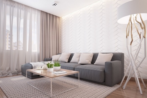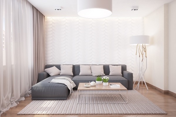 ห้องนั่งเล่นตกแต่งสวยงามด้วยโทนสีขาวและน้ำตาลของไม้ธรรมชาติ เข้ากับสีเทาของโซฟาตัวแอลกลางห้องได้ดี กำแพงสีขาวก็มี Texture ที่ดูเรียบหรูสวยงาม