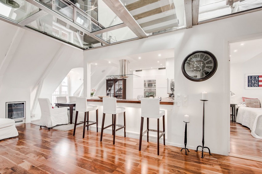 ภายในห้องอพาร์ทเม้นท์ใต้หลังคาห้องนี้ มีด้วยกันทั้งหมด 2 ชั้น ชั้นแรกเป็นส่วนของห้องครัว ห้องรับประทานอาหาร ตกแต่งด้วยโทนสีขาวเป็นหลัก ตัดด้วยสีของไม้บริเวณพื้น มุมโต๊ะรับประทานอาหารจัดอยู่ตรงบริเวณโครงสร้างลาดของหลังคารับกันได้อย่างพอดี มีบันไดขึ้นสู่ชั้นสอง บริเวณพื้นด้านบนนั้นทำเป็นกระจก มองเห็นพื้นที่ส่วนของชั้นล่างได้ชัดเจน สวยงามมากทีเดียวเลยค่ะ บริเวณใต้หลังคาส่วนบนสุดนี้ ตกแต่งเป็นห้องนอน และมีห้องนั่งเล่นอยู่ใกล้ๆ โซฟาหนังสีน้ำตาลก็ตัดกันดีกับการตกแต่งสีขาวโดยรอบ บรรยากาศภายในสดใสและสว่าง ทำเอารู้สึกสดชื่นมากๆ เลยทีเดียว เห็นแล้วใครอยากมีห้องที่สวยงามแบบนี้กันบ้างคะ ถ้าหากว่าชอบก็ชมเป็นไอเดีย หรือ เก็บไว้เป็นแบบตัวเลือกไว้ประยุกต์ตกแต่งที่อยู่ของคุณกันได้เลยนะคะ