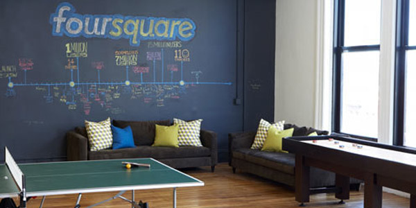 คงไม่มีใครในโลกออนไลน์ที่ไม่รู้จัก foursquare ใช่มั้ยล่ะค่ะ วันนี้ foursquare เติบโตมาก เริ่มขยับขยายออฟฟิศไปตามเมืองใหญ่ๆ และวันนี้เรามี ออฟฟิศใหม่ foursquare ที่อยู่ในโซโห มาให้ได้ชมกันคะ เป็นการตกแต่งโดย Fluff, Derek Stewart and Dennis Crowley ตกแต่งในสไตล์ลอฟต์ทวินเทจ มีสีสันเก๋ๆ เท่ๆ ดูอบอุ่นอย่างบอกไม่ถูกค่ะ ว่าแล้วเรามาชมออฟฟิศใหม่ของ foursquare กันเลย