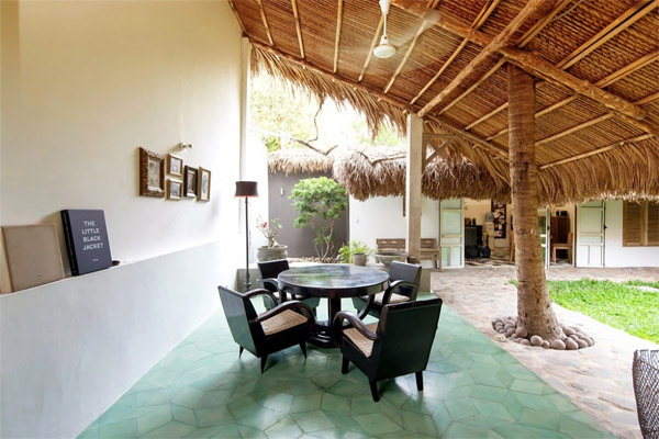 พวกเขาแต่งบ้านในสไตล์พื้นเมือง แต่เน้นความร่มเย็นจากต้นไม้ และสนามหญ้า เนื้อที่ทั้งหมดของบ้านหลังนี้มีขนาด 3,200 ตารางฟุต แวดล้อมไปด้วยสนามหญ้าสีเขียวและ ลานเปิดโล่งแบบ outdoor มีการนำหญ้าคามามุงเป็นหลังคาเพื่อให้กลมกลืนกับธรรมชาติที่อยู่อาศัย ดูเป็นมิตรกับสิ่งแวดล้อมเลยทีเดียวค่ะ มุมห้องสมุด อ่านหนังสือ ติดตั้งบานกระจกขนาดใหญ่สำหรับการมองเห็นความสวยงามของต้นไม้ใบหญ้า ได้อย่างสบายตา สบายใจ ส่วนบานหน้าต่าง เลือกใช้ของเก่ามาทำเป็นบานประตู