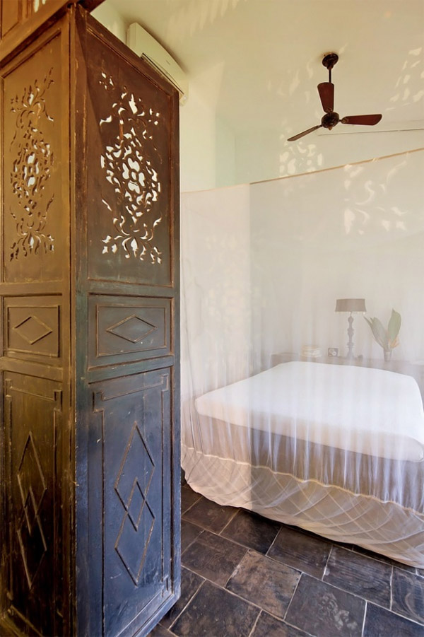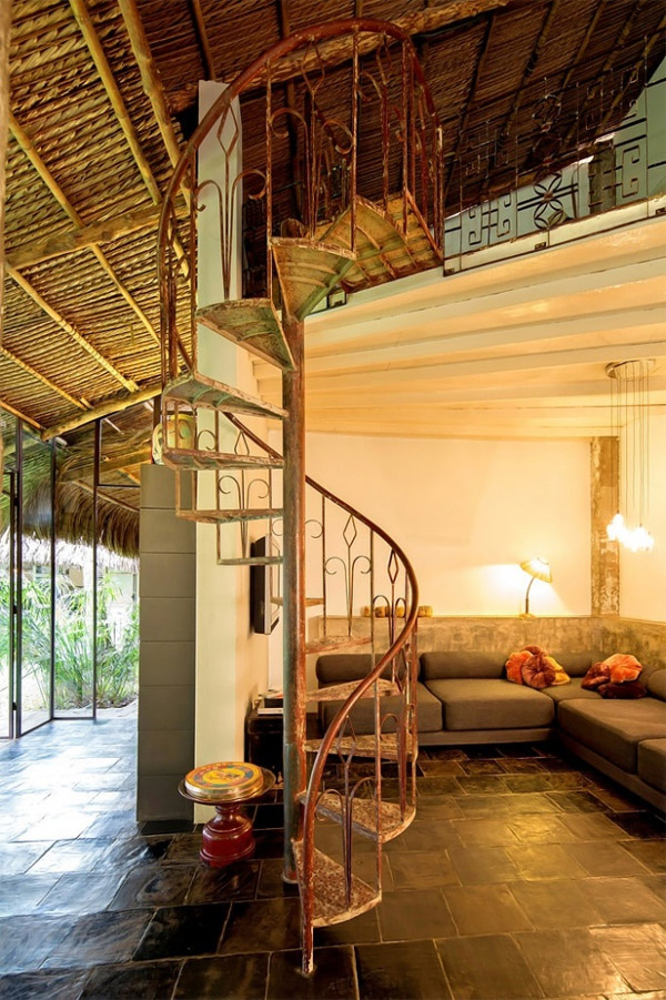 ภายในห้องนอนใหญ่ มีฉากกั้นห้องที่เป็นของเก่าโบราณจากเวียดนามที่พวกเขาสรรหามาตกแต่งบ้าน เพื่อจะได้เป็นธีมเดียวกันทั้งหมด ส่วนห้องนั่งเล่น เป็นมุมพักผ่อนที่โมเดิร์นทันสมัยขึ้นมาหน่อย เพราะเลือกใช้โซฟาเดย์เบดขนาดใหญ่ ตัดกับบันไดวนแบบโบราณ ที่ดูเท่ไม่น้อยเลยคะ เรียกได้ว่าความสวยงามในแบบธรรมชาติพื้นเมืองของบ้านหลังนี้ สวยเรียบง่าย และน่าอยู่มากๆ เลยค่ะ
