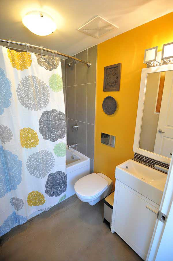 ห้องครัวขนาดเล็กใช้กระเบื้องโมเสกประดับตกแต่งบนท๊อปเคาท์เตอร์สีดำสุดเก๋ มีชั้นเก็บของใช้ในครัวที่เรียงรายอยู่บนผนังห้องครัว ซึ่งช่วยให้สามารถเก็บของต่างๆ ได้มากขึ้น ด้านข้างมีกระจกบานใหญ่ช่วยให้แสงส่องผ่านเข้ามาในบ้าน ทำให้บ้านดูโปร่ง โล่งมากขึ้น และยังมีพื้นที่สำหรับนั่งเล่นริมหน้าต่างได้อีกด้วย ในส่วนของห้องน้ำมีการตกแต่งอย่างน่ารัก เน้นโทนสีเทา เหลือง การจัดวางของสุขภัณฑ์ต่าง ๆ อย่างลงตัว ทำให้ห้องน้ำดูไม่คับแคบ และดูสวยสะอาดตาอีกด้วย