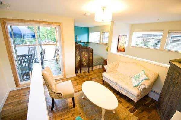 ในส่วนของชั้นบนจะเป็นมุมของห้องนั่งเล่นที่อยู่ริมบันได มีการจัดวางเฟอร์นิเจอร์ขนาดเล็ก ๆ แต่ดูสวยงามลงตัว ถัดไปเป็นห้องนอนและระเบียงหน้าบ้านที่มีชุดเก้าอี้กลางสวนไว้นั่งเล่นได้อีกด้วย ว่าแล้วเรามาชมบ้านเล็กดีไซน์เก๋หลังนี้กันเลยค่ะ