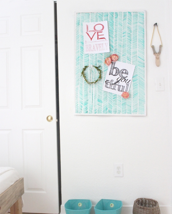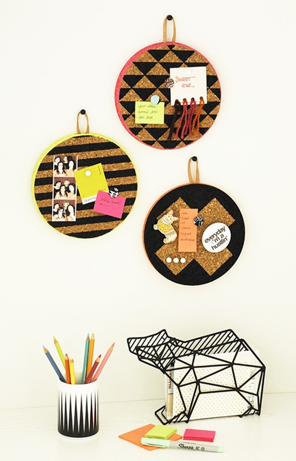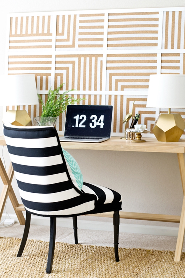 ไอเดียที่ 9 นำกระดานไม้ก๊อกหลายๆ แผ่นมาเรียงต่อกัน แล้วระบายสีเป็นลายเส้นตรงกิ๊บเก๋ ตกแต่งกำแพงบริเวณโต๊ะทำงานก็ไอเดียน่าสนใจนะคะ จะติดกระดาษโน๊ตตรงไหน รูปถ่ายยังไงก็ได้ทั้งนั้น สารพัดประโยชน์ทีเดียว