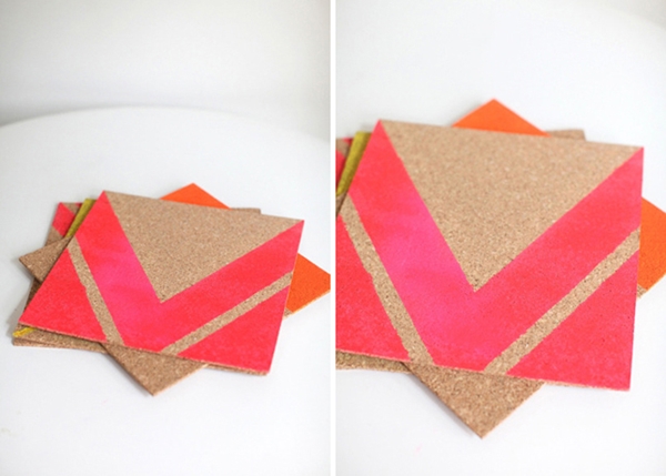 ไอเดียที่ 10 ไอเดียทำที่รองแก้วอีกสไตล์ ตัดไม้ก๊อกเป็นแผ่นสี่เหลี่ยม แต่ใช้สีนีออนในการเพ้นท์ ก็จะได้ที่รองแก้วสวยๆ ชิค และดูเก๋ไปอีกแบบต่างจากไอเดียที่ 2 แต่ก็สวยเหมือนๆ กันเลย