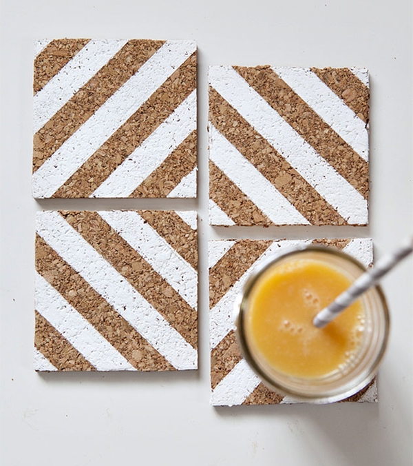 ไอเดียที่ 2 ที่รองแก้วสไตล์เรียบเก๋ ก็ใช้ไม้ก๊อกทำออกมาได้ง่ายมากๆ เพียงแค่ตัดเป็นสี่เหลี่ยมแล้วทาสีขาวเป็นลายเส้นตรงขวางสักหน่อย แค่นี้ก็ดูดีมีสไตล์ขึ้นได้แล้ว แถมยังช่วยรักษาเฟอร์นิเจอร์ที่ใช้วางแก้วน้ำด้วยนะ ไม่ให้พอง เสียหายจากน้ำได้ค่ะ อีกทั้งยังทำให้โต๊ะดูสวยขึ้นด้วย เป็นการตกแต่งไปในตัว