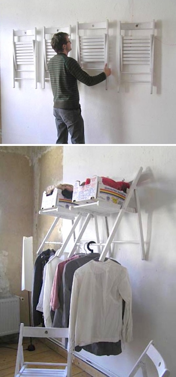 16. เก้าอี้พับตัวเก่าๆ มาทาสีให้สวยเหมือนใหม่ แล้วแขวนบนกำแพง กลายเป็นชั้นวางของและราวแขวนเสื้อก็ได้
