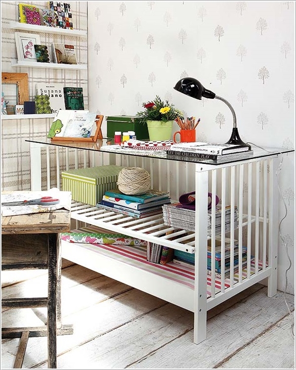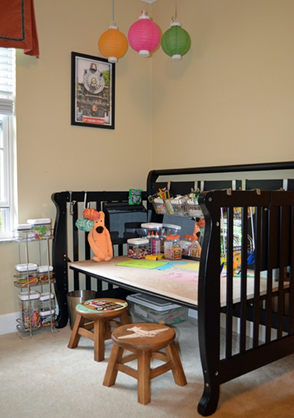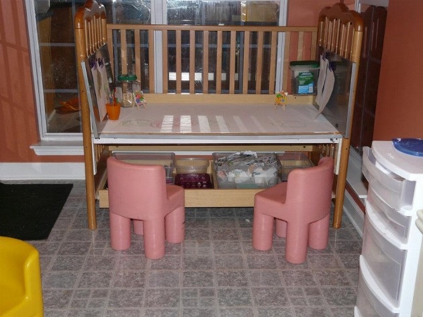 Cr : http://childdrivenlearning.wordpress.com/2012/03/09/turn-the-unused-cage-crib-into-a-desk/