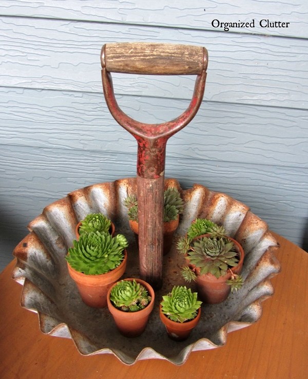 ไอเดียที่ 2 เอาจอบกับถาดทรงคัพเค้กมาทำเป็นที่ปลูกต้นไม้พวกกระบองเพชร พืชอวบน้ำ กระถางเล็กๆ แบบนี้ ก็ดูสวยเป็นสัดส่วนดีทีเดียว