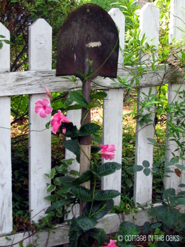 ไอเดียที่ 7 นอกจากเป็นอุปกรณ์ทำสวนแล้ว ยังสามารถใช้จอบหรือคราดมาทำที่ปลูกต้นไม้แบบไม้เลื้อยเกร๋ๆ ดูวินเทจไว้ที่สวนก็ได้