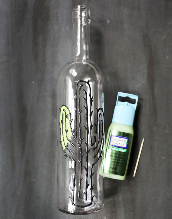 STEP 3 นำเอาสีเพ้นท์กระจกสีเขียวเฉดต่างๆ สีแดง มาเพ้นท์ลงไปบนขวดแก้วที่เราวาดกระบองเพชรแบบต่างๆ เอาไว้ แล้วใช้ไม้จิ้มฟัน เป็นตัวเกลี่ยให้สีเพ้นท์กระจายเต็มสวยงาม จากนั้นทิ้งเอาไว้ 2-3 ชั่วโมงหรือจนกว่าสีจะแห้ง เก็บรายละเอียดต่างๆ อีกนิด ถ้ามีพื้นที่ต้องเพ้นท์สีอีก ก็อาจจะเพ้นท์กันต่อไปค่ะ หากไม่มีแล้ว ก็นำไปตกแต่งบ้านสวยงามได้เลย