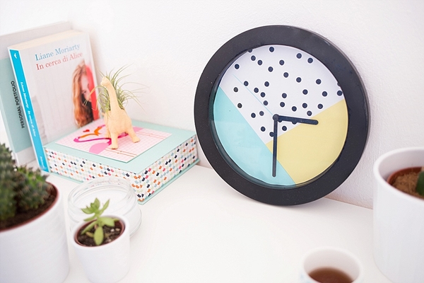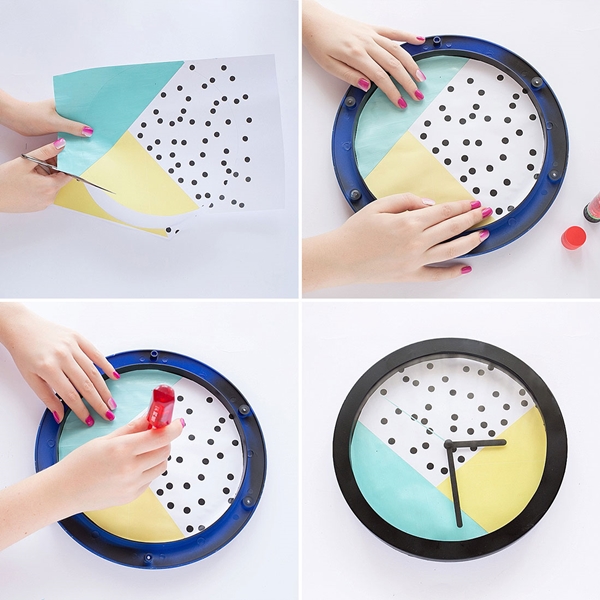 3.ตัดกระดาษแพทเทิร์นเป็นรูปวงกลม ตามรอยดินสอที่ร่างเอาไว้ แล้วนำเอากระดาษเข้าไปใส่ลงในหน้าปัดนาฬิกาเรือนเดิม ใช้กาวติดให้แน่น จากนั้นก็นำเอาส่วนประกอบของนาฬิกากลับมาใส่ให้เหมือนเดิม จัดการใส่ถ่านให้เรียบร้อย ก็พร้อมนำไปติดผนังสวยๆ บอกเวลากันแล้วค่ะ