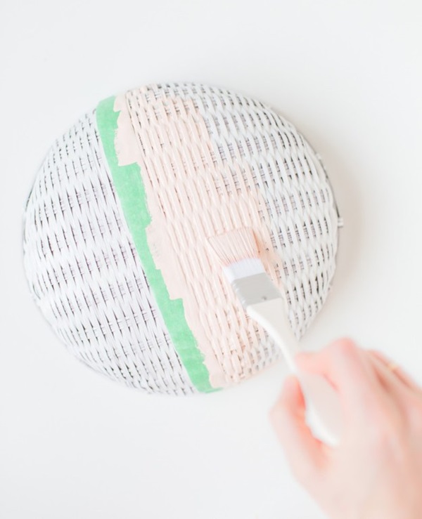 STEP 2 ใช้พู่กันจุ่มสีที่ชอบแล้วลงมือเพ้นท์ฝาชี โดยแบ่งพื้นที่ทาสีออกเป็น 3 ส่วน ส่วนแรกเป็นครึ่งวงกลม ตรงกลางเป็นสี่เหลี่ยมผืนผ้าเล็กๆ และอีกส่วนเป็นครึ่งวงกลม ตามรูปทรงของฝาชี