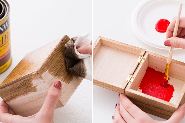 STEP 1 นำเอา Wood Stain มาทาเคลือบลงไปไม้ โดยใช้เศษผ้าหรือกระดาษเช็ดมือชุบ Wood Stain แล้วนำมาถูลงบนกล่องไม้ที่เตรียมไว้ จากนั้นใช้สีเพ้นท์ที่เตรียมเอาไว้ มาทาลงไปบริเวณด้านในกล่องไม้