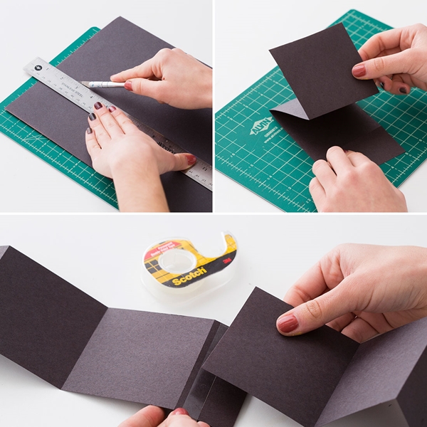 STEP 3 ตัดกระดาษสีดำที่เตรียมไว้ โดยตัดให้มีความกว้างเล็กกว่าขนาดของกล่องไม้สี่เหลี่ยมที่ใช้ประมาณ 0.5 นิ้ว เพื่อทำให้เป็นแผ่น Pop-Up โดยวิธีทำคือ พับกระดาษแผ่นยาวที่กว้างเท่าขนาดกล่องเป็นทบๆ ให้ได้เท่ากับจำนวนรูปถ่าย (เช่น ใช้รูปถ่าย 6 รูป กระดาษสี่เหลี่ยมที่ต้องมี 6 แผ่นต่อกัน )