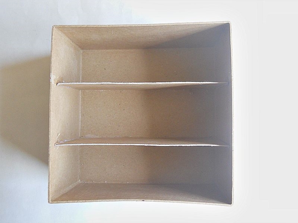 STEP 2 นำเอากระดาษกล่อง 2 ชิ้นที่ตัดใน STEP ที่ 1 มาติดกาวที่ขอบกระดาษสามด้าน แล้วนำเข้าไปติดลงในกล่องกระดาษด้านใน ทำเป็นชั้นสำหรับกล่อง (ดังรูป)