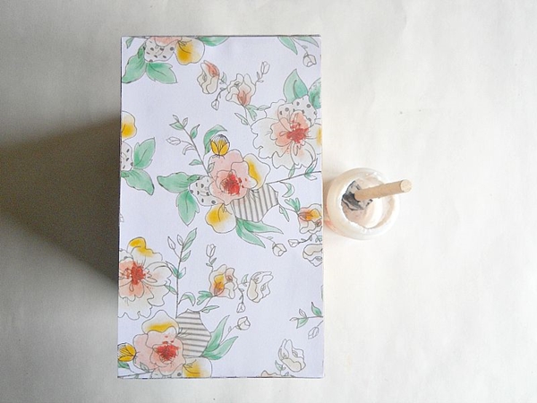 STEP 6 วัดขนาดกระดาษ Scrapbook หรือ กระดาษห่อของขวัญให้มีขนาดเท่ากับตัวกล่องด้านบน ด้านข้างทั้งสองฝั่ง และ ด้านล่างให้เรียบร้อย จากนั้นก็ทำการติดกระดาษลงไปยังบริเวณด้านนอกตัวกล่องให้สวยงาม