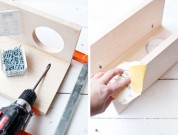 STEP 2 ทากาวที่บริเวณสันของแผ่นไม้ที่มีหลุมวางแก้วน้ำเรียบร้อยด้านหนึ่ง จากนั้นก็ใช้แผ่นไม้สำหรับทำด้านข้างแปะลงไปให้แน่น จากนั้นก็ทำอีกครั้งหนึ่ง แต่เป็นอีกด้านค่ะ