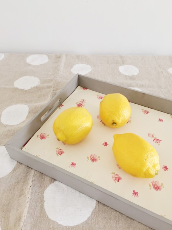 วิธีทำ ตัดวอลเปเปอร์ให้มีขนาดเล็กกว่าบริเวณถาดที่รองวางอาหารประมาณ 1/4 นิ้ว แล้วฉีดสเปรย์กาวลงไปที่ถาด ติดวอลเปเปอร์ลงไปให้เรียบร้อย ใช้ลูกกลิ้งทับให้เรียบสวยงาม เท่านี้ก็เปลี่ยนลายถาดอาหารไม้ที่ธรรมดาๆ ให้มีลวดลายและดูมีสไตล์ สวยงามขึ้นได้แล้วนะคะ