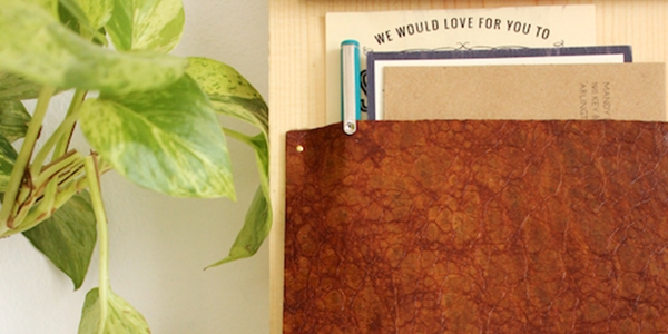 สิ่งที่เรากำลังทำ : บอร์ดไม้เก็บเอกสารที่มีแผ่นหนังเป็นส่วนของซองเก็บเอกสารนั่นเอง