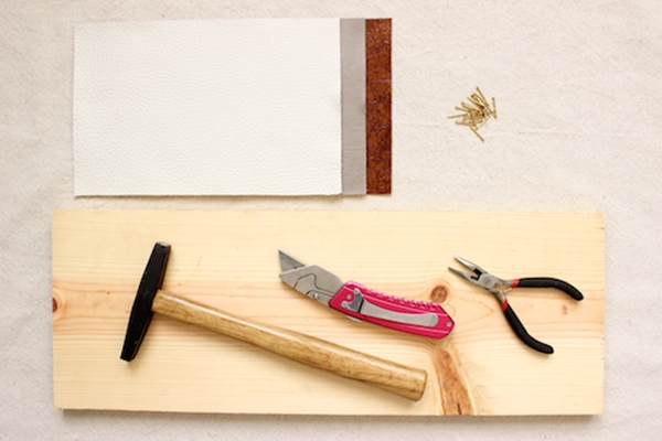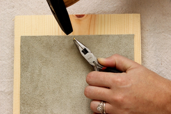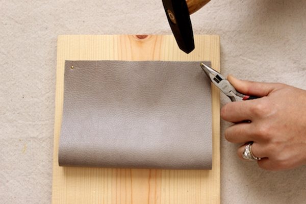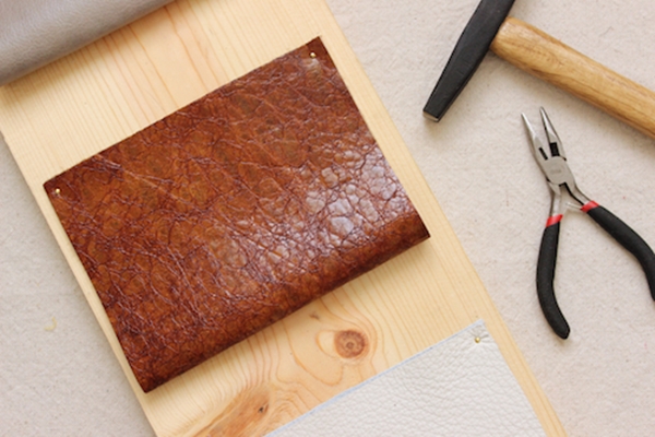 STEP 2 วางแผ่นหนังสีเทาหงายขึ้นไว้ตรงกลางแผ่นไม้ (จะเหลือขอบไม้ทั้งสองฝั่งเท่ากัน) จากนั้นเอาตะปูทองเหลืองตอกลงไปตรงกลาง เพื่อยึดแผ่นหนังเข้ากับแผ่นไม้ให้ติดกัน จากนั้นก็พับแผ่นหนังขึ้นมาแล้วตอกตะปูลงไปที่ขอบซ้ายและขวาของแผ่นหนัง ยึดให้แผ่นหนังติดกับแผ่นไม้ให้แน่น